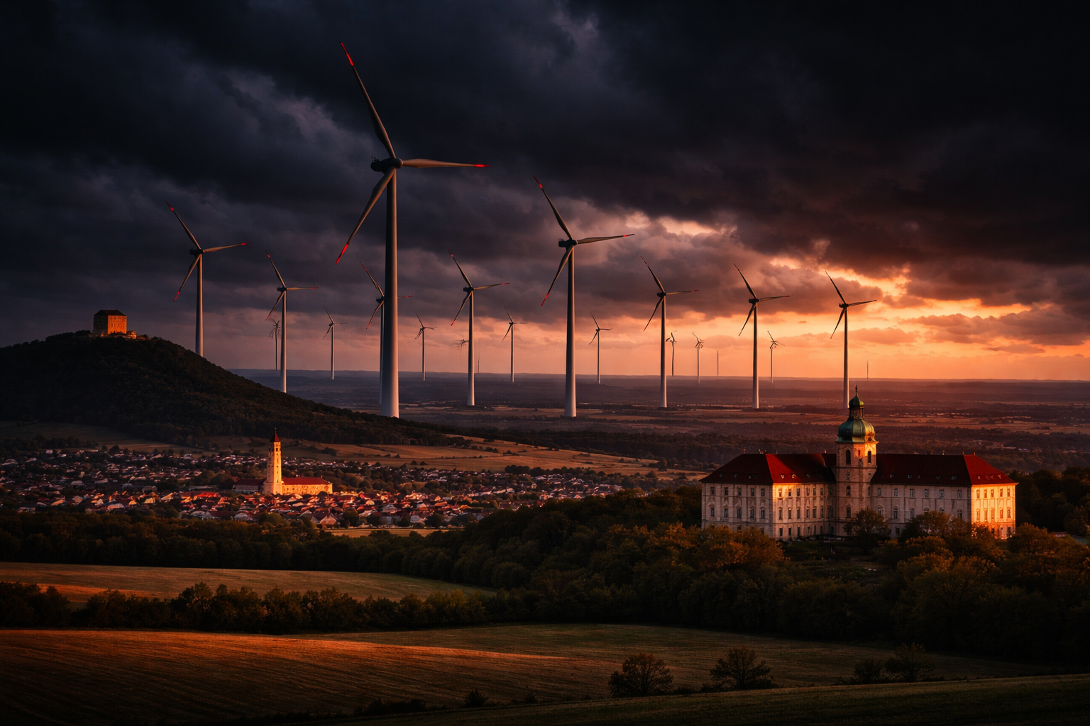 Obr. viz výše – ilustrační vizualizace sloužící k přiblížení možného rozsahu a dopadů záměru v krajině. Nejde o skutečný ani schválený stav.