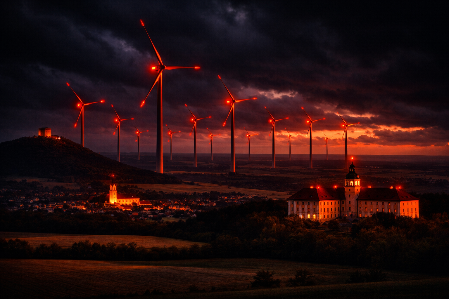 Obr. viz výše – ilustrační vizualizace sloužící k přiblížení možného rozsahu a dopadů záměru v krajině. Nejde o skutečný ani schválený stav.